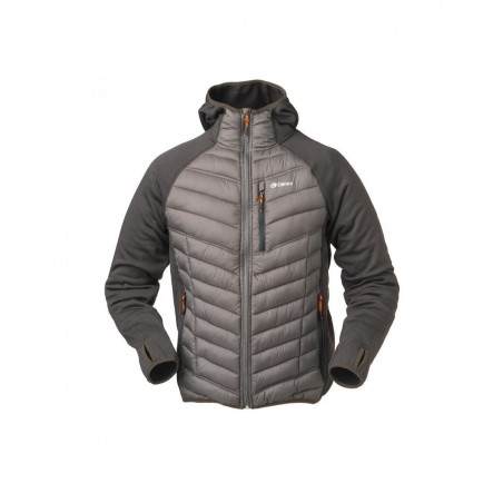 Chaqueta térmica híbrida con aislamiento de fibra esponjosa en cuerpo y espalda de 120gr. Combinada con tejido elástico en mangas, laterales del cuerpo y capucha. Ligera y cálida. Peso: 400 g.